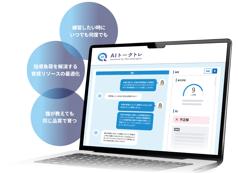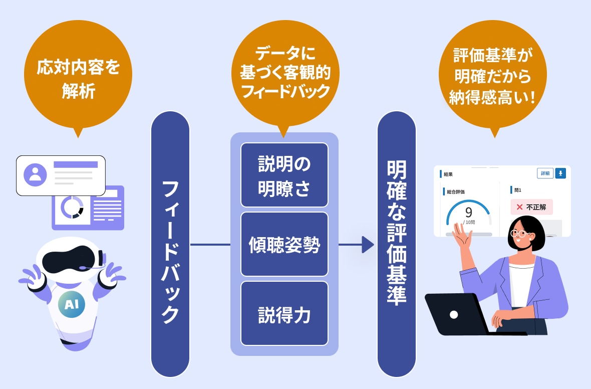 管理者が設定した評価基準(例:傾聴姿勢、論理的な指導力)に基づき、AIがロープレ内容を即座に、客観的に評価。