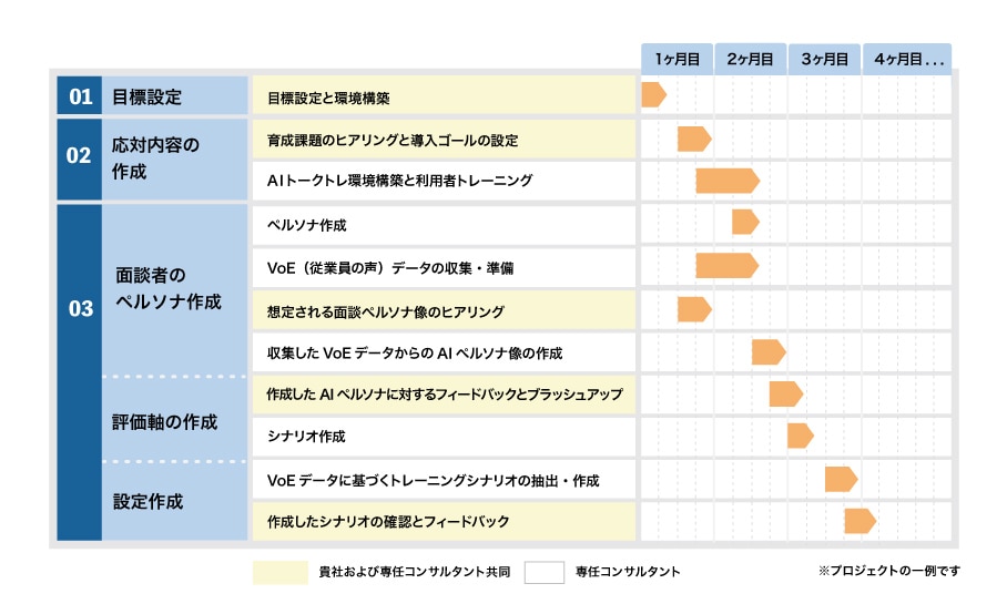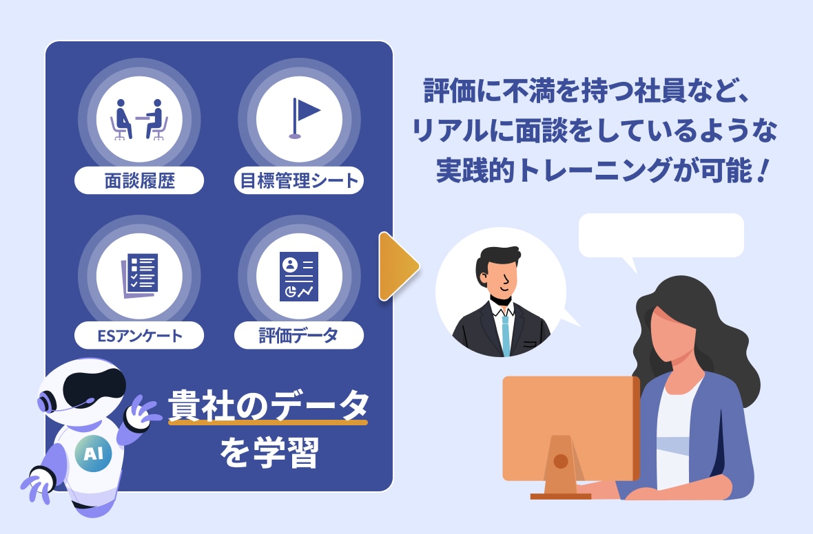 A. | 実際の会話履歴や社内データ(面談履歴、ESアンケート、目標管理シート、マニュアル、FAQ、トークスクリプトなど)をインプットデータとして活用し、貴社専用の AI トレーナーを構築します。貴社データの準備が難しい場合は、弊社の汎用テンプレートやシナリオをご利用いただけます。 |