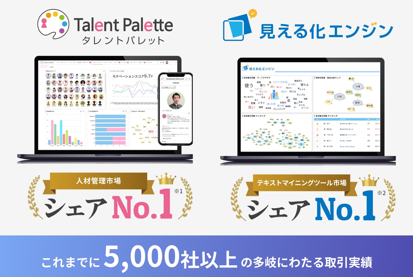 人材管理市場シェアNo.1(※1)の「タレントパレット」、テキストマイニング市場で14年連続シェアNo.1(※2)の「見える化エンジン」などの開発・提供を通じて培った、あらゆる業界・業種に合わせた高度なデータ活用ノウハウが基盤です。