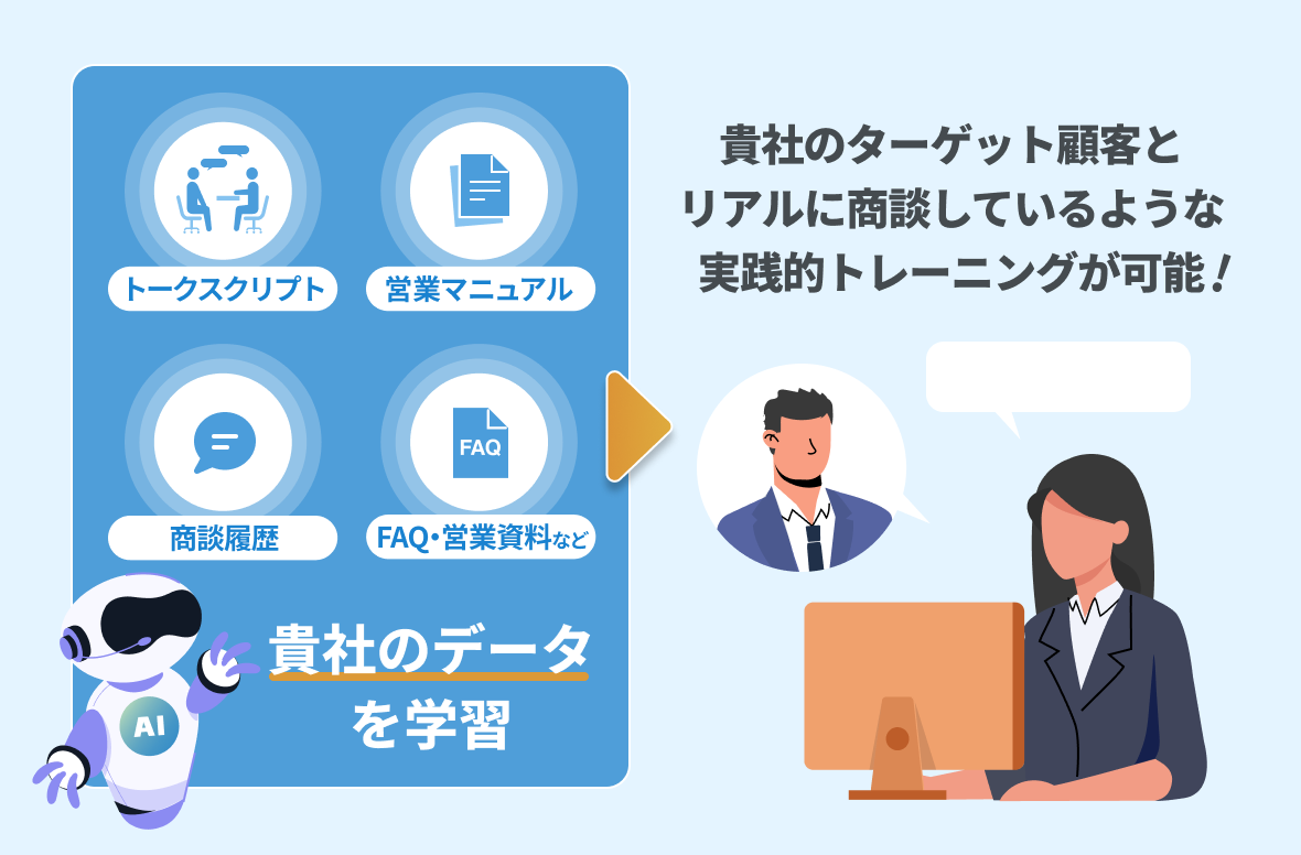 A. | 実際の会話履歴や社内データ(営業トークスクリプト、コールログ、受注/失注案件履歴、商品説明資料、応対マニュアル、FAQなど)をインプットデータとして活用し、貴社専用のAIトレーナーを構築します。貴社データの準備が難しい場合は、弊社の汎用テンプレートやシナリオをご利用いただけます。 |