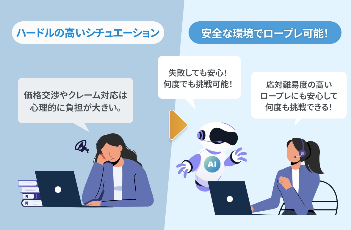 AI相手だから、価格交渉や難易度の高いクレーム対応も「失敗を恐れず」挑戦可能。