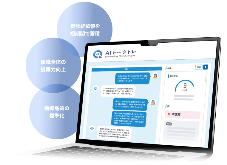 スコアリングと具体的な改善コメントを提示します。これにより、指導者の評価工数を大幅に削減し、商談品質の標準化と自律的な学習を促します。
