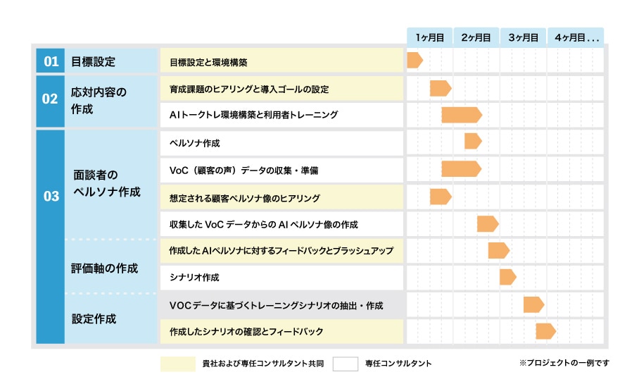 お預かりした商談履歴やトークスクリプト、コールログ等を活用し、貴社専用の顧客ペルソナや評価基準を設定。すぐに使える環境を構築します。導入初期は、汎用的な商談スキルや評価軸のテンプレートを活用し、スピーディなスタートも可能です。